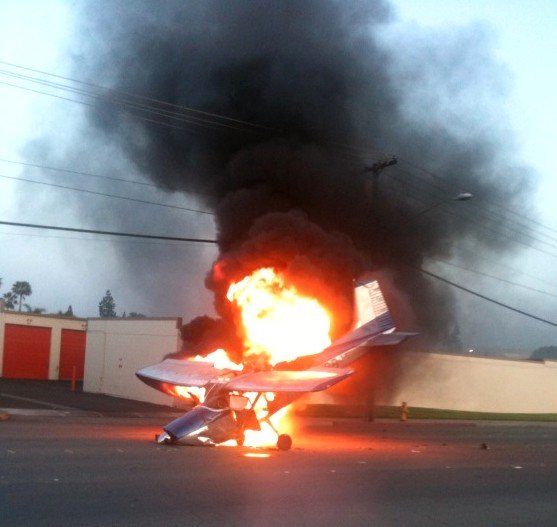 February 19, 2010 (El Cajon) — A single engine Cessna made a crash landing on Johnson Avenue just north of Fletcher Parkway in El Cajon Friday evening shortly after 7 p.m. The two men onboard were able to crawl from the wreckage just before the plane burst into flames. Fire crews from Heartland Fire & Rescue in El Cajon quickly arrived on scene and had the fire out in less than five minutes.