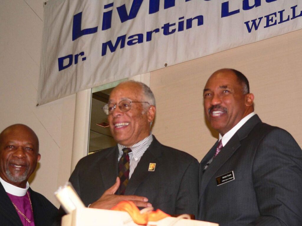 Printer-friendly version January 15, 2010 (San Diego) – In a powerful speech, Rev. Samuel “Billy” Kyles, last surviving witness to the assassination of Martin Luther King, Jr., brought tears to the eyes of many with his recollections of King’s final hours and an impassioned plea for audience members to “hold fast to your dreams.” Kyles spoke at the YMCA of San Diego’s 25th annual Dr. Martin Luther King, Jr. Human Dignity Awards breakfast this morning at the Town and Country Hotel. Click image above to view the stirring finale of his speech. To view the other segments of his speech, view our 6-part video series at: https://www.youtube.com/user/EastCountyMagazine/search?query=Kyles Kyles, 75, has served as pastor of the Monumental Baptist Church in Memphis for the past half century and has been a leading figure in the civil rights movement nationally. He helped integrate public schools , city buses, public places and workplaces in Memphis. A leader in the Rainbow Coalition/PUSH, he also serves on the National Civil Rights Museum Board of Directors. He has won numerous awrsds including the Tennessee Living Legend Award, City of Memphis Humanitarian Award, Ford Freedom Legacy Award, and the International Civil Rights Walk of Fame. In San Diego, his speech recalled the dreams of his ancestors, who were slaves, and urged those in the audience to continue King’s legacy by aspiring to fulfill their own dreams. Election of Barack Obama, the first African-American president, demonstrates how far America has come in race relations, he noted. He spoke movingly of King’s courage in coming to Memphis to lead striking garbage workers after surviving a stabbing, and recalled King speaking of death in a prescient way. He also recalled his own family’s battle to fight segregation in the South and offered inspirational words that drew a standing ovation following his fiery oratory. Dee Sanford, chair of the event, met Kyles on a tour of the Civil Rights Museum in Memphis and invited him to be the keynote speaker for the event, which also featured performances by the Martin Luther King Jr. Community Choir San Diego. (Click here to view a video of the choir’s performance) In addition, the San Diego City Council presented a proclamation declared today Rev. Samuel Billy Kyles day in the city. A sell-out crowd of over 1,000 people attended the event, which has grown dramatically in attendance from the first year’s crowd of 40 or 50 people. Robert Countryman (photo: center right), a long-time YMCA board member and chair of the Y’s scholarship dinner, was presented the 20120 Human Dignity Award in honor of his work helping youths in our region. Emily Galloway presented a Youth Poetry tribute and Rich Collato, president and CEO of the YMCA of San Diego, offered reflections on King’s life. Buffalo Soldiers Color Guard presented the flag for the opening of the ceremonies. The morning ended with a benediction by Rev. Amos Johnson, Jr. of New Creation Church, followed by the audience reciting a “Living the Dream Pledge” and the choir singing “We Shall Overcome.” Printer-friendly version