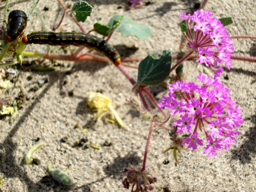 Printer-friendly version March 12, 2015 (Anza Borrego Desert) – Kristin Kjaero visited the Anza Borrego desert Tuesday, where she observed “thousands of caterpillars in a feeding frenzy…The roads were dotted with yellow splotches.” Standing still for just a few moments to take a photo, she adds, “I had caterpillars crawl onto each foot.” After munching on the flower fields, these caterpillars will ultimately turn into white sphinx moths – which in turn help pollinate flowers to assure future growth. Printer-friendly version