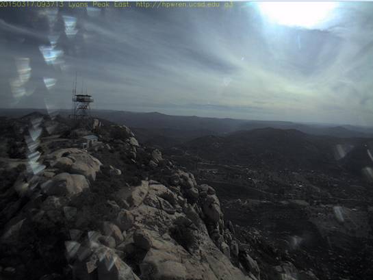 Printer-friendly version March 18, 2015 (Jamul)—The HP Wren UCSD webcam atop Lyons Peak in Jamul caught this dazzling sunrise on St. Patrick’s Day. Sure ‘n’ those glistening jewels in the sky look like a Leprechaun’s treasure! Printer-friendly version