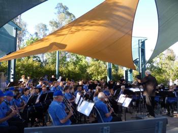 By Jaime Mirman August 13, 2015 (Rancho San Diego)–The San Diego Concert Band and The Water Conservation Garden presented An Evening of Music in the Garden last July 26th. Coincidentally, the Band is celebrating its 26th season this year, and their program immersed the listeners into an exciting display of treasured songs, rousing marches and gripping contemporary pieces. The annual event took place for the third year at the amphitheater in the Water Conservation Garden at Cuyamaca College, which proved to be a visually and acoustically effective environment for the performance. As expected, San Diego Concert Band delivered its interpretations with gusto, thunder and finesse. Their care and dedication succeed as a most welcome musical contribution to our community. Some of the highlights of the program included the theme march for The Bandwagon, a Japanese radio station two-hour band music program under Band director Yutaka Nishida, who commissioned Philip Sparke to write this piece. It opened presenting the melody with the euphoniums and French horns, and displaying a glittering instrumentation that engaged the various sections weaving melodies and counter-melodies plus an intriguing modulation towards the end of the piece. The Purple Carnival March by Harry L. (Harold) Alford was performed by a low brass quartet of 2 euphoniums and 2 tubas, as arranged by Paul Hemond who plays euphonium in the Band. The quartet combination provided unexpected colorings and technical prowess from the musicians. (photo, right) Foster on my Mind, a collection of songs of Stephen Foster superbly arranged by Takahashi Yoshide, enfolded the songs with a sparkling Hollywood movie style orchestration and chromatic harmony. The band sections were confronted in infectious counterpoints, and the first chairs presented us with engaging solos throughout the piece. (Photo, left) Colonial Song, originally written for piano in 1911 by the Australian composer Percy Grainger, was in his own words “an attempt to write a melody as typical of the Australian countryside as Stephen Foster‘s exquisite songs are typical of rural America”. Despite the fact that the melodies of Colonial Song are original and not folk song, they do convey a sentimental and evocative character. Moonlight Serenade by Glenn Miller as arranged by Naohiro Iwai received a stylish and vital performance in which the Band director Mr. Roy Anthony briefly danced onstage, gallantly partnering with his wife Cathi in celebration of their anniversary. (Photo, right.) Flight, composed by Claude T Smith was adopted as the official theme song by the Air and Space Museum of the Smithsonian Museums in Washington, DC. This is a stirring and victorious march with an extended development, containing a slight reference to the Air Force Song along with the whole Pachelbel’s Canon. Mr. Roy Anthony excelled in leading the San Diego Concert Band with an unquestionable savoir faire and utmost commitment to the interpretation of each piece across the entire program. (Photo, right: Roy Anthony with Water Conservation Garden Director John Bolton. Guests also enjoyed strolling the grounds before the concert and at intermission, enjoying the beautiful grounds and learning more about water-wise landscaping; photo, left.) For more information on the San Diego Concert Band, visit http://www.sandiegoconcertband.com. To learn more about the Water Conservation Garden, visit www.TheGarden.org. Jaime Mirman graduated as the first French Horn Master in Music from the National University of Mexico. He has played in Mexico at the National Symphony Orchestra and the Symphonic Band of the Ministry of Public Education, as well as chamber music, teaching and arranging.
