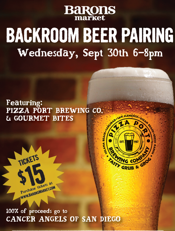 September 29, 2015 (San Diego) – Barons Market will host “Backroom Beer Pairing,” featuring locally made brews from Pizza Port Brewing Co. and yummy delights from Gourmet Bites. The event will be held on Wednesday, September 30 from 6 to 8 p.m. Join Barons Market at 1347 Tavern Road in Alpine to raise money for local breast cancer support. Tickets are $15 and may be purchased online at www.BaronsMarket.com. All proceeds go to CANCER ANGELS OF SAN DIEGO.