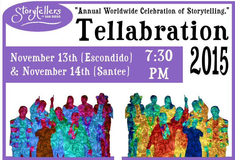 “Thou shalt not” is soon forgotten, but “Once upon a time” lasts forever.” (Philip Pullman) October 22, 2015 (Santee and Escondido)–Tellabration is a global celebration of the art of oral storytelling. Storytelling is the conveying of events in words, images and sounds, often by improvisation or embellishment. Stories or narratives have been shared in every culture as a means of entertainment, education, cultural preservation and in order to instill moral values. Crucial elements of stories and storytelling include plot, characters and narrative point of view. A smorgasbord of stories is awaiting you told by some of San Diego’s best professional tellers representing the Storytellers of San Diego – Linda Whiteside, Fred Laskowski, Aunt Li-Anne, Patti Christensen & James Nelson-Lucas, Mindy Donner, Mary Holma, Marilyn McPhie, and Jim Dieckmann will present traditional folk tales, literary works and original stories on two consecutive days both starting at 7:30 PM. Friday, November 13th Escondido Chalice UU Congregation 2324 Miller Ave. Escondido, CA 92029 Info: 760.737.0393 Saturday, November 14th Santee Summit UU Fellowship 8778 Cottonwood Ave. #1 Santee, CA 92071 Info: 619.562.0833 Tickets at the door: $15 Event info: Li-Anne – 760.716.3614 Bios of tellers & other info on www.storytellersofsandiego.org
