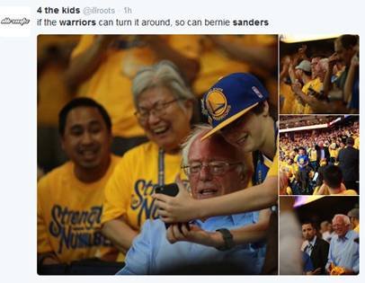 Printer-friendly version   East County Magazine Photo: Twitter  May 30, 2016 (Oakland) – After several campaign stops including addressing a crowd of 60,000 people in Oakland, Senator Bernie Sanders took time out to enjoy a Warriors game along with actor/activist Danny Glover at Oracle Arena, where the Golden State Warriors are playing Game 7 of the NBA’s Western Conference Finals against the Oklahoma City Thunder. The winner will go on to play for the NBA Championship. According to Joe Garofoli with the San Francisco Chronicle,  they arrived at halftime and Glover pulled on a Warriors “strength in numbers” T-shirt before entering the stands.  Accompanied by Secret Service agents, Sanders an Glover walked to the seats – section 108 row 15, behind the Thunder basket. “Good seats but not the ones frequented by millionaires,” Garofoli says. Nearby the crowd chanted “Bernie! Bernie!” with many fans taking photos and selfies with Sanders. Garofoli, a pool reporter covering the campaign, observed, ”After your pooler stood too long in front of his seat one fan groused “get out of here. The second half is starting. This isn’t a political event.” Sanders standing out w blue Oxford shirt in sea of yellow tshirts. Afterward, when the Warriors won, the parallels were not lost on Sanders.  “We came in the second half and the Warriors turned it around,” Sanders said. “The Warriors were down 3-1 and they turned it around and I think that that’s what we’re going to do, too. A very good omen for our campaign.” So was it because of him? “Absolutely. No question about it,” Sanders said and smiled knowingly. “What other explanation is there?” What If they had lost?  “Hey, in politics,” Sanders said. “You gotta take your shots.”  After the game Sanders dined with former Labor Secretary Robert Reich.   Printer-friendly version