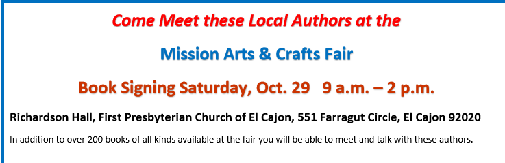 East County News Service October 25, 2016 (El Cajon) – The Mission Arts & Crafts Fair will be this Saturday, October 29 fro 9 a.m. to 2 p.m. Jewelry, woodworking items, craft, artwork, plants, books of all kinds, baked goods, homemade candy and more. There will be a drawing for handmade quilt and other opportunity drawings. There will also be drawings for homemade candyand nuts. There will also be succulents, bulbs, accessories, gifts and collectibles, canned food goodies, church memorabilia and a cafe. Also inside the hall will be book signings by local authors Gale Gene, Tom Hom, Del Hood and Sharon Snyder. The event will be held at First Presbyterian Church, Richardson Hall, 501 Farragut Circle, El Cajon, 92020. For information call 619-442-2583.