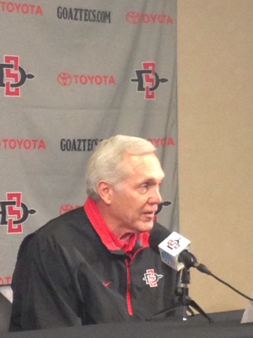 Story and photos by Liz Alper Full quotes courtesy Jen Heisel October 25, 2016 (San Diego) – With their last Friday night game of the season against Utah State this week, San Diego State head coach Rocky Long, senior linebacker Austin Wyatt-Thayer and junior running back and kick returner Rashaad Penny spoke to media at this week’s press conference. “As has been the case for the last three or four weeks, we have another important conference game this week,” Long opened. “…the crowd is loud and supportive of their team and that makes sense since the last five years or so, they’re 26-4 at home. Obviously, they play really well at home. We’ll have to play well in order to win.” Although SDSU quarterback Christian Chapman is pretty physical and likes to run the ball a lot, Utah State starter Kent Myers is even more athletic. “…he’s a very talented guy,” Long said. “He throws the ball very, very well and I think he’s the third leading rusher on their team. He’s the key because he runs the ball so well.” Wyatt-Thayer added on: “He’s a dual threat quarterback. That’s always a challenge.” There has been concern over the play of the Aztec defense, but Long says that his defense has played well over the last three weeks. On Friday night against San Jose State, there was a bit of controversy. A targeting penalty against Penny was overturned and another targeting penalty was called against Donnel Pumphrey. The SJSU player who targeted Pumphrey was ejected. As he was coming off the field, the SJSU players and staff on the sideline were congratulating him, or at least appeared to be doing so. Long didn’t think so. “I don’t think they were congratulating him for the hit. I think they were consoling him because he got kicked out of the game. He was one of their best players and he made a really good football play by old time standards. Those people on that sideline know he’s a good guy and a good player, he just got kicked out of the game and he doesn’t get to play next week. They were more consoling him than congratulating him especially because DJ was fine and in the next play, he ran for a touchdown. Why would you be congratulating him? He made DJ mad.” Penny echoed that sentiment and said that his overturned targeting penalty was just a good play and that the penalty against Pumphrey was definitely targeting. And of course, Long talked about new SDSU athletic director John David Wicker. “I had a good relationship with him. When he was here, he was in charge of football and we interacted almost daily. He and I were together a lot of the time. He’s a guy that has a lot of integrity and works really hard. He cares about this place. He cares about our success and the student-athlete experience. I thought the best thing about him being hired is the whole department knows him and he knows the whole department. He was here with Jim Sterk at the time that a lot of changes were made and has had a positive effect on this department, so you have good continuity there. He already said something about what’s most important for the football program and that’s getting a new stadium. It’s good that he’s got the right frame of mind.” Wyatt-Thayer was asked if there’s anything for the defense to work on against Utah State. “I feel like we can just work on the little things, more technique: not missing tackles or making any assignment errors, just little things like that throughout the game.” Penny said there wasn’t much for them to work on either. “Our defense is just holding these guys. It feels good when you see your defense is out there doing their job; it’s makes the job of the offense easier.” He also talked about Utah State’s defense. “They’re big, athletic and they can move. Just like any other front, we just have to prepare the same way we did the last few weeks. We just have to run straight downhill and playing to the best of our abilities. We just have to prepare. They’re pretty big and they always can move. It’s nothing we haven’t seen so we’re ready.” Penny feels that the offense is “where it needs to be.” He said there’s nothing they really need to work on, but the team as a whole needs to get better at penalties. “I feel like we just make simple mistakes with our penalties alone. I think that’s something we can get better. It’s just the little mistakes that are bothering us right now.”