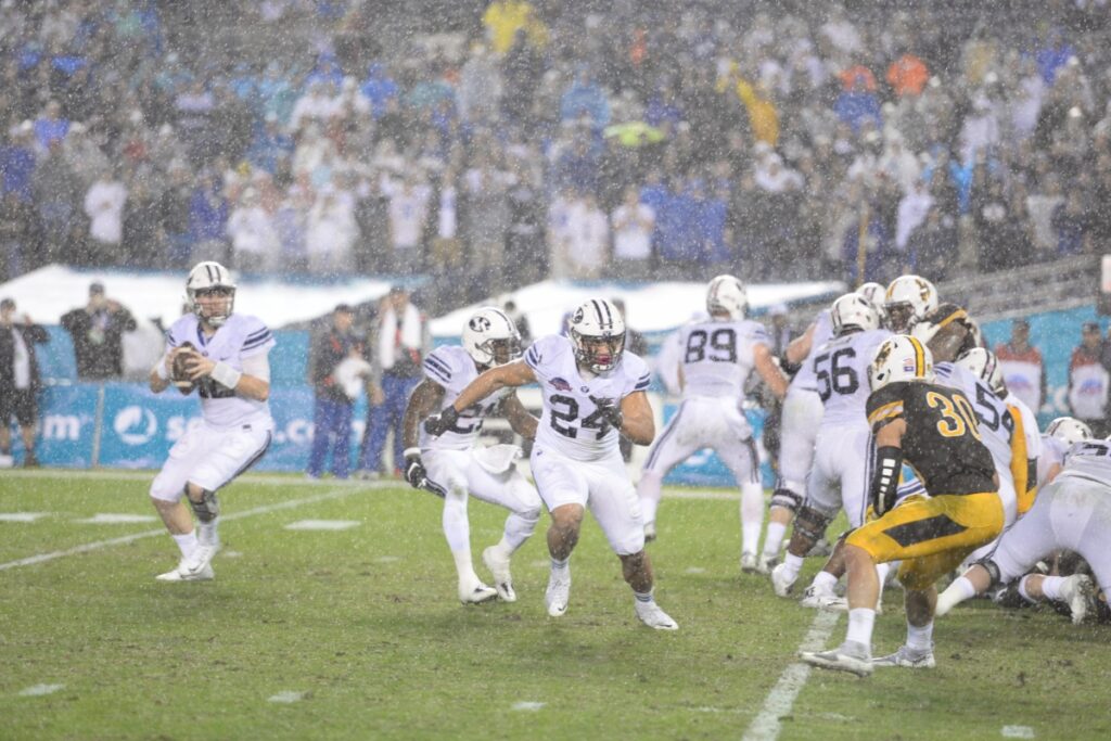 By Liz Alper Photo by Cris Rangel December 21, 2016 (San Diego) – The San Diego County Credit Union Poinsettia Bowl was played on a cold, rainy night at Qualcomm between BYU and the team that was a thorn in SDSU’s side until they defeated them in this year’s Mountain West championship game, Wyoming. At the end of the first quarter, after Wyoming senior punter Ethan Wood bobbled a punt, BYU took over on the turnover and sophomore quarterback Tanner Mangum punched it in and the Cougars took the lead 7-0. Sophomore kicker Rhett Almond added three more in the second to put the Cougs up 10-0 at the half. In the second half, the Cowboys finally tallied with a drive filled with fourth down conversions. Junior running back Brian Hill ran it in at the goal line for the touchdown and Wyoming trailed by three, 10-7. But after a big catch good for 39 yards by redshirt senior El Cajon native and Grossmont College transfer Nick Kurtz, the Cougars were at the goal line. Mangum avoided pressure and threw a ball to the end zone that was bobbled by Kurtz and eventually caught by junior tight end Tanner Balderree for the touchdown. BYU was up by 10 again, 17-7. Early in the fourth, senior running back Jamaal Williams broke free and added seven more for the Cougars with a touchdown run and BYU put this one out of reach of the Cowboys 24-7. The Cowboys didn’t go away; redshirt sophomore transfer quarterback Josh Allen passed to senior Tanner Gentry and the Cowboys were in double digits as the Cougars led 24-14. Wyoming got one last hurrah when Gentry made a tremendous grab and reached the end zone and just like that, the Cougars’ 24-7 lead was whittled down to a field goal, 24-21. But just like Philip Rivers, Allen throws game-ending interceptions too, as he threw one to senior safety Kai Nacua that allowed BYU to hold onto their lead and win the Poinsettia Bowl 24-21. Like our sports coverage? Donate to help support ECM’s Sports section!