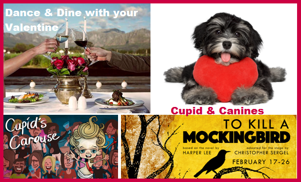 East County News Service January 26, 2017 (San Diego’s East County) — This week’s Destination East County includes party with the stars, cabaret nights, What the Butler Saw, and a Courtly Noise concert. Plus, we’ll tell you about coming attractions including Cupid’s Carouse, a production of To Kill a Mockingbird, a Celtic guitar concert, Cuyamaca College’s powwow, Cupids and Canines, plus Dancing and Dining with your Valentine. So scroll down for all of these events and many more! WHAT THE BUTLER SAW: JAN. 20-FEB. 19 IN LA MESA Lamplighters Theatre in La Mesa’s production of “What the Butler Saw,” a classic British farce, continues now through Feb. 19th. When a psychiatrist tries to seduce an aspiring secretary, his botched efforts lead to comic bedlam involving his insatiable wife, a randy bellhop, a befuddled police officer and Sir Winston Churchill. For tickets and details you can visit www.LamplightersLaMesa.com. CABARET NIGHTS JAN. 27-28 IN SPRING VALLEY Young Actors Theater will host cabaret nights on Friday and Saturday, January 27th and 28th at the Y-A-T theater in Spring Valley. The cabaret nights showcase talented Y-A-T members performing musical, dance and acting performances to benefit the theatrical group. For tickets you can visit www.YATSanDiego.org. PARTY IN THE STARS JAN. 28 IN LA MESA The La Mesa Arts Foundation invites you to “Party in the Stars” at the La Mesa Community Center on January 28th. The event benefits the La Mesa Arts Academy. The event will be held from 6:30 to 9:30 p.m. Party in the Stars will include live music, food and a silent auction. For tickets visit www.LaMesaArts.org. ICE SKATING AT VIEJAS NOW THROUGH JAN. 29 This weekend is your last chance to enjoy outdoor ice skating at the Viejas Outlet Center in Alpine, which closes Sunday evening, until the next holiday season. For details, you can visit www.Viejas.com. COURTLY NOYSE CONCERT JAN. 29 AT MISSION TRAILS Mission Trails Regional Park will host a (free) concert featuring Courtly Noyse on January 29th at 3 p.m. performing Renaissance music. The group began singing madrigals atop Mount Palomar and has since added instrumentalists. Just like our forebears in the sixteenth century, you can while away an afternoon with music, storytelling and humor. You can find details at MTRP.org. NOW FOR A PREVIEW OF COMING ATTRACTIONS… CUYAMACA COLLEGE POW WOW FEB. 4 The Native American Student Alliance at Cuyamaca College will host its 3rd Annual Powwow on Saturday, February 4th from 10:30 a.m. to 8 p.m. in front of the Communication Arts complex. The powwow aims to promote Native American heritage with activities, including Bird Singing, a native singing style of the Kumeyaay people honoring culture and traditions of local tribes. The event also includes arts and craft vendors, foods, drums, native dances and more. For details, visit www.Cuyamaca.edu. CUPID’S CAROUSE FEB. 11 IN LA MESA The nonprofit Hearts for San Diego invites you to show some love by attending Cupid’s Carouse, an annual tasting party on Saturday, February 11th at 7 pm. at the La Mesa Community Center. Wines, beers and spirits will be paired with Valentine favorite foods and tasty sweets. There will also be a silent auction and raffle. Hearts for San Diego has helped raise funds for other nonprofit organizations helping veterans, special needs children, animals and the environment. For tickets, visit www.HeartsforSD.org. HAWAIIAN AND CELTIC GUITARIST IN LA MESA FEB. 11 Acoustic guitarist, singer and songwriter Jim Earp will perform Hawaiian and Celtic guitar music, as well as folk-rock songs at the San Pasqual Winery Tasting Room and Gallery in La Mesa on Saturday, February 11th from 7 to 10 p.m. Wine and cheese are available for the performance in the winery’s cozy back room. For details, you can go to SanPasqualWinery.com. CUPIDS AND CANINES ADOPTIONS FEB. 12 AT GROSSMONT CENTER If you’re looking for some puppy love, over 100 dogs and puppies from local recue groups will be at Grossmont Center looking for a loving home during the Cupids and Canines Pet Adoption event on February 12th from 11 a.m. to 3 p.m. You’re invited to meet, play with and learn about each dog—and if you find your perfect match, you can take your new furry friend home this Valentine’s Day weekend! Dozens of pet adoption groups will be onsite for this special event. For more information, visit www.GrossmontCenter.com. DANCE AND DINE, DEAR VALENTINE: ROUNDUP GRILL IN SANTA YSABEL FEB. 14 The Roundup Grill in Santa Ysabel (26439 Highway 76) invites you to dance and dine with your valentine on February 14th. Your feast by Chef John Little will be paired with wines from Ramona Ranch Winery, from bubbly to beef short ribs braised with Cabernet and chocolate, to a surprise desert. Live fiddle music by Celia will combine jazz and blues, zydeco and Celtic music for dancing the night away with your sweetheart. For tickets and details, visit www.RamonaRanch.com and click on “what’s the buzz.” TO KILL A MOCKINGBIRD: FEB. 17-26 IN SANTEE Pickwick Players will present “To Kill a Mockingbird” February 17th through 26th at Off Broadway Live (9490 Cuyamaca St.) In Santee. Based on the Pulitzer Prize winning novel by Harper Lee, To Kill a Mockingbird is the timeless and timely story of attorney Atticus Finch and his children Scout and Jem in the summer of 1935 in Maycomb, Alabama. Atticus strives to raise his children to be willing to see the world from other peoples’ perspectives. But when Atticus agrees to defend a young black man unfairly accused of accosting a white woman, he finds his children and himself in grave danger. This coming-of-age story of prejudice and violence, tolerance and community is as relevant today as it was when it was first published in 1960. The novel was adapted to a screenplay which won the Academy Award for Best Picture. For tickets and details, visit www.PickwickPlayers.net. That’s all for this week! If you 