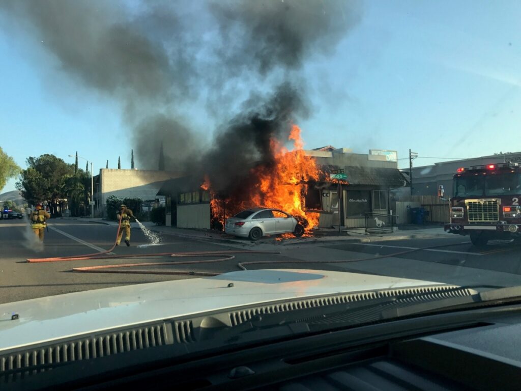 By Miriam Raftery Photos courtesy of Lakeside Fire July 2, 2017 (Lakeside) – A mother and sons are homeless after a fire that began with a vehicle striking a commercial building next door spread into their residence yesterday. A GoFundMe page has been started to assist the victims, For: LaVonne Kraus, Tory Rodriguez, Richard Rodriguez, Jesse Rodriguez. The Solis Hair Salon has also been heavily damaged. Lakeside Fire reports that a second fire occurred in the same building today, causing even more damage before firefighters were able to douse the blaze. The first fire resulted from a road rage incident in which case a victim of road rage had reportedly exited the freeway and was heading to a Sheriff station to report the incident, which the vehicle from which they were fleeing tried to block the first vehicle and slammed into the building, NBC 7 reports. The Sheriff’s Department initiated a pursuit of a white sedan leaving the crash, ending in arrest or Ruben Chavez on drug and weapon charges. But deputies later said that this was not the same vehicle involved in the road-rage crash. The Sheriff is seeking the occupants of that vehicle, a man with a ponytail and tattooed arms, and a woman who was with him. Call Crime Stoppers at (888) 580-8477 with information and you will remain anonymous. You may be eligible for up to a $1,000 reward for information leading to a felony arrest.