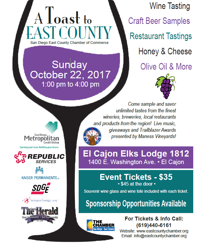 By Miriam Raftery October 8, 2017 (El Cajon) – The San Diego East County Chamber of Commerce will present this year’s “A Toast to East County” on Sunday, October 22 from 1 to 4 p.m. at the El Cajon Elks Lodge 1812 (1400 E. Washington Ave., El Cajon). The event ($35 in advance or $45 at the door) includes wine tasting, craft beer samples, restaurant tastings, honey and cheese, olive oil and more –plus live music, giveaways and Trailblazer Awards presented by Maness Vineyards. A souvenir wine glass and wine toast is included with your ticket. For tickets, all (619)440-6161. Find more information at www.EastCountyChamber.org.