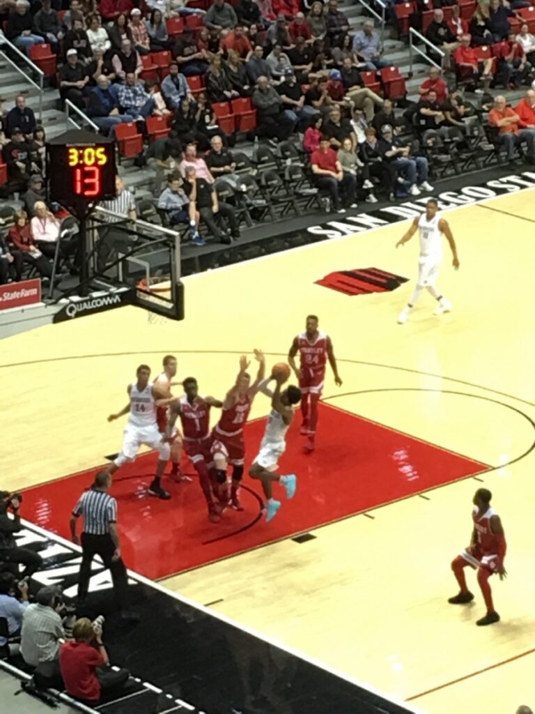 Like our sports coverage? Donate to help support ECM’s sports section! Type “Sports” on the donation line! Check out our sports section for more sports stories! Follow @ECMagSports on Twitter for live sports coverage and stories! Story and photos by Liz Alper December 2, 2017 (San Diego) – Following a big win at Jenny Craig Pavilion against USD on Thursday night, SDSU men’s basketball finally returned home for a Sunday matinee against the 7-1 Bradley Braves as part of the annual Mountain West-Missouri Valley Challenge. In case you were wondering, Bradley is a private university in Peoria, Illinois with 5,400 students. This is the first time the Aztecs have seen the Braves since 1967. After a nice opening pass from freshman Matt Mitchell to senior Malik Pope for the tip-in, the Aztecs had an easy ride against a 7-1 team that wasn’t playing like a 7-1 team. In fact, the Braves didn’t score their first two points until four minutes in when junior guard Dwayne Lautier-Ogunleye laid it in. Their last point for seven minutes was a free throw by senior guard Jojo McGlaston. Junior forward Luuk Van Bree broke the draught with two straight buckets that got the Braves into double digits, but the Aztecs still led by more than 20. And as usual for the Aztecs, the freshmen shone. Today it was the redshirter Jalen McDaniels, who notched seven points within the first nine minutes of the first half. Junior Jeremy Hemsley had just as many. Bradley stepped it up a little bit, but the Aztecs slammed on the gas towards the end of the half and went to the locker room up 37-23. Things were back to normal in the second half; Bradley went back to missing 99% of their shots and the Aztecs were able to take advantage of their constant fouling. Three Aztecs reached double digits in points; Hemsley, Pope and McDaniels. And they did it all without senior Trey Kell. McDaniels earned himself a double double with a career-high 14 points and 12 rebounds as the Aztecs took this one by a landslide, 75-52. “I’m happy with our performance tonight,” head coach Brian Dutcher said after the game. “…I thought our kids competed at a really high level today. They came out, worked hard on the glass…we shot a pretty good percentage, our defense was great…we defended well, we rebounded well and that usually leads to a good outcome.” The Aztecs stay home and will host Cal on Saturday. Tipoff is at 2:00 p.m. Box Postgame notes Postgame quotes