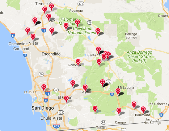 Photo, left: Map of outages in San Diego County as of 7:45 a.m. today. December 8, 2017 (San Diego’s East County) — SDG&E has sent warnings to 170,000 San Diego County residents to be prepared for power shutdowns due to the high fire danger posed by strong Santa Ana winds. The utility has already shut off power to thousands of homes in communities across our region including portions of Alpine, Bonsall, Boulevard, Campo, Cuyamaca, Descanso, Fallbrook, Jamul, Julian, Mount Laguna, Potrero, Ramona, Santa Ysabel, Vista and more. The utility has warned residents that their power could remain off for several days until it can be safely restored. The shut-offs, meant to prevent powerline fires such as those that ignited the 2007 firestorms, are sparking concerns and outrage among some residents, particularly in rural areas. Electric well pumps don’t work with the power out, leaving no way to provide water for people or livestock. Some rural areas lack cell phone service, leaving people with no way to learn about wildfires or other emergencies, unless they have a backup generator. Many residents are also shivering in cold temperatures dipping into the 40s at night, some left without electric heating. The widespread shut-offs comes just days after the California Public Utilities Commission ruled that SDG&E cannot charge ratepayers for its uninsured losses from damages in three of the 2007 wildfires that state regulators found were caused by SDG&E’s power lines. Another complaint has been the lack of accessible shelters. Only two shelters for those with power outages have been opened – one in Escondido, the other in El Cajon. In the mountain, high desert and rural communities, those shelters were an hour or even an hour and an half away – and completely inaccessible on Thursday, when Interstate 8 east of Alpine was shut down due to winds so strong that they flipped over a semi truck and a 30-foot trailer. Nancy Bauler Satallante posted on Facebook, “”A rep from SDGE just called me & told me it could be days until power is restored. I used the opportunity to let him know that this should’ve been handled differently….I also told him that they should bring a water truck out to help people w/ animals who are all electric…Also to set up a red cross emergency center out here so people can have a hot meal, etc. Having this many people w/ no power there needs to be more than ONE Red Cross shelter. Not everyone can get to El Cajon. The “need” is out here in the backcountry!! I hope that my suggestions will help!!” Red Cross spokesperson Emily Cox told us Thursday, “I know it is a little far, but we coordinate with County Office of Emergency Services and SDG&E to determine the safest place for us to put the shelters and we needed to have locations far enough from the potentially affected area so that they would maintain the safety. The recommendation was made for locations within the city limits of El Cajon and Escondido to guarantee full service for the shelters and we will evaluate the need for additional locations throughout the next few days.” Jan Hedlun, a Potrero resident and member of the Potrero Community Planning Group, says repairs on a pole in front of her home were delayed more than a year. She questions why maintenance was postponed until the current high wind conditions were eminent. “ I believe strongly that SDG&E dropped a major ball with their method of shutting down electricity, telling folks it will be days before they turn it on, and doing nothing to help,” she states in an email to ECM. “Potrero has two circuits – one from the Campo area and one through Barrett. The Campo link went off this morning and the Barrett link was shut off around 1:00 PM. On the outage map earlier in the day the restoration time was set for Monday the 11th. Now it’s Saturday the 9th at 4:00 PM. I love how they say: “If your power is out, please be sure you have adequate emergency supplies on hand for an extended period of time and check here for the most current information on expected restoration times.” They certainly didn’t give adequate warning for people to be prepared, especially those with livestock. And if cell service is out, power is out . . . how can anyone check the website? Really?” Hedlun adds, “I believe that Ms. Satallante is correct that the company should have set up the area better. They knew this event was coming long before we did and could have made arrangements. It should be mandatory if they are going to deprive us of service.” Supervisor Dianne Jacob, asked by ECM whether such extended shut-offs are warrented in her view, replied, “I’m concerned about any shutoffs because they can pose their own risks to property and life in a crisis, especially in rural areas where fire crews and residents need access to well water. I urge SDG&E to cut power only as a last resort and only if there’s the danger of an actual system failure that could ignite a wildfire.” ECM also contacted the offices of Assembly members Ben Hueso and Randy Voepel, who represent mountain and rural communities most severely impacted by the shut-offs, but thus far we have not received a response. California Public Utilities Commission spokesman Christopher Chow confirmed that such shut-offs are authorized by the CPUC. In an email to ECM, he wrote, “Decision 12-04-024, issued April 26, 2012 (http://docs.cpuc.ca.gov/PublishedDocs/WORD_PDF/FINAL_DECISION/165063.PDF gave SDG&E authority under Public Utilities Code sections 399.2(a) and 451 to shut off power in emergency situations when necessary to protect public safety, including a situation where strong Santa Ana winds exceed the design basis for SDG&E’s overhead power-line facilities and threaten to topple energized power lines onto tinder dry brush. Public Utilities Code Section 399.2 requires utilities to operate their distribution grid safely. There is language in Decision 12-04-024 that references this