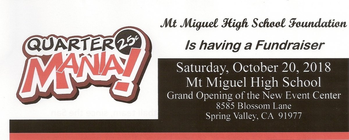 Printer-friendly version East County News Service September 6, 2018 (Spring Valley) – Mt. Miguel High School Foundation will present “QUARTERMANIA,” a cross between an auction, raffle and bingo. The