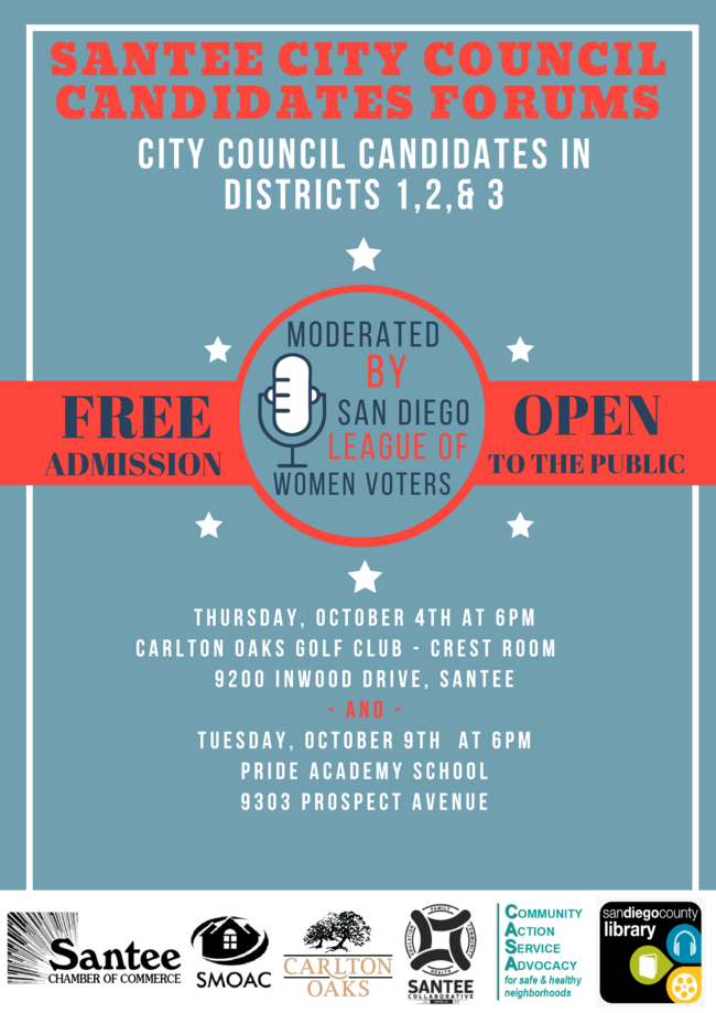 Printer-friendly version East County News Service October 2, 2018 (Santee) – Santee’s Council races have attracted seven candidates for three seats, drawing strong public interest following a