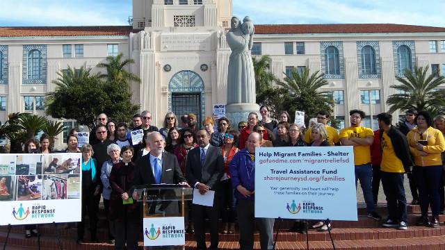 By Chris Jennewein Reprinted with permission from Times of San Diego, a member of the San Diego Online News Association Photo: Jewish Family Service CEO Michael Hopkins speaks to the press after the Board of Supervisors vote. Photo by Chris Jennewein January 8, 2019 (San Diego) – The San Diego County Board of Supervisors voted Tuesday to help a coalition of local nonprofit groups assist asylum seekers by providing temporary shelter on county property. “Now it falls to us to say, as leaders, what can we do? We have the obligation to help,” said newly elected Supervisor Nathan Fletcher at his first board meeting. The supervisors directed staff to locate county-owned property that could be used on temporary basis and established a task force to seek longer term solutions as well as solicit federal and state assistance. Any shelter proposal involving county money would need board approval first, as would any additional costs for support services. Since last fall, Immigration and Customs Enforcement officers have been dropping asylum seekers at bus stations and other public locations with identifying ankle bracelets but no assistance. A coalition of nonprofits led by Jewish Family Service of San Diego, the ACLU Foundation of San Diego & Imperial Counties, SEIU Local 221 and the San Diego Organizing Project have provided temporary shelter and meals to over 4,500 people, primarily women and children. Most of the refugees helped by the ad-hoc San Diego Rapid Response Network are housed for just 24 to 48 hours until travel arrangements can be made. Jewish Family Service CEO Michael Hopkins said he was pleased with the vote and singled out the efforts of Fletcher and Supervisor Greg Cox, but warned that the shelter currently used would not be available after February. “We are so pleased with the vote, but I do have to tell you there’s a long way to go,” Hopkins said at a press conference outside the county administration building. Two supervisors, Daine Jacob and Kristin Gaspar, voted against providing county property on a temporary basis, with Jacob saying the first priority is to house San Diego County’s own homeless population. “Our priority should be to take care of our own first,” Jacob said. “We do have a potential health crisis with the refugee situation, but we also have to press hard on the federal government to fix this.” San Diego has a long history of helping immigrants, from European refugees to Vietnamese boat people and more recently Chaldeans from Iraq. The ACLU’s David Trujillo noted San Diego’s “rich history of being a welcoming place for people looking for asylum” and said the community must continue to help. “Every asylum seeker has the right to humane treatment,” said Trujillo. “This is a leadership moment, and San Diego must provide leadership.”