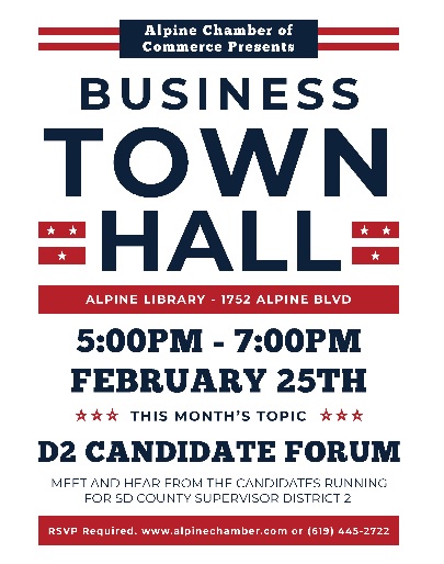 East County News Service February 15, 2020 (Alpine) – The Alpine Chamber of Commerce will host a business townhall and candidate forum for those running in the San Diego 2nd Supervisorial District to fill the vacancy to be left by Dianne Jacob’s retirement. The forum will be held on Tuesday, Feb. 25 from 5-7 p.m. at the Alpine library, 1752 Alpine Blvd., Alpine CA 91901. All four candidates running have confirmed that they will attend. They are former State Senator Joel Anderson, Poway Mayor Steve Vaus, behavioral health consultant Kenya Taylor, and homebuilder/rancher Brian Sesko. RSVPs are required by calling (619) 445-2722.