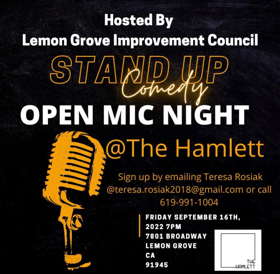 Printer-friendly versionEast County News Service September 11, 2022 (Lemon Grove) – The Lemon Grove Improvement Council invites you to stand up comedy open mic night at the Hamlett coffee house. The fun begins at 7 p.m. Want to perform? Sign up by emailing Teresa Rosiak at teresa.rosial2019@gmail.com or call 619-991-1004. The Hamlett is located at 7801 Broadway in Lemon Grove, on the corner of Broadway and Lemon Grove Avenue. Printer-friendly version