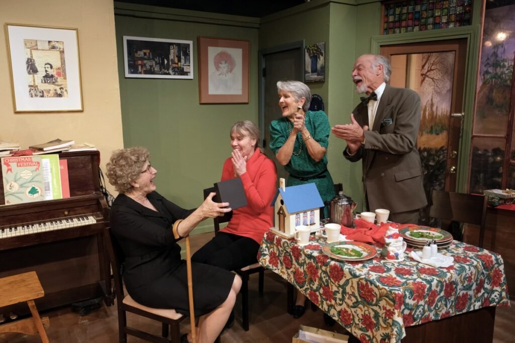 Printer-friendly versionBy Kathy Carpenter June 6, 2023 (La Mesa) – “Gioia di vivere!” The joy of living is expressed in Slikworms, Lamplighters Theatre’s latest production, by local playwright Connie Terwilliger. A world premiere, Silkworms represents three generations of women. Silkworms need mulberry leaves to survive; both are interdependent. Similarly, the women in this play need each other for support and love. The grandmother provides wisdom and guidance, the mother provides love and support and the daughter provides hope and new beginnings. Together, they form a strong and unbreakable bond that sustains them through good times and bad. Silkworms is relatable, humorous and poignant. Silkworms takes place in New York on Christmas Eve 1966 in the living room of Helen Ingleow. Helen lives with her 89 year old mom, Faye, and is preparing for what she hopes will be the perfect visit with her daughter Claire, and Claire’s boyfriend, Roger. The visit does not go as planned. Being full–time caretaker for her mom, plus her church duties have taken their toll on Helen. Living with Roger and supporting him and his crazy investments has left Claire unhappy and unfulfilled. This slice of life story is the catalyst to bring them together to connect in ways they haven’t before, giving them the emotional strength to move forward with their lives. Dennis Floyd directs the five–character play. Helen is played by Lesa Sailors, the mother, a character with whom many can identify. Sailors’ performance is relatable. Ellen Lawson takes on Faye, the grandma. Faye’s mental capacity is fading. Lawson delivers the audience’s favorite character, a lovable, wise old woman. Erin Collins is Claire, the daughter, who feels she grew up with a lack of love expressed, thus taking in strays, people she hopes will show her love in appreciation of her help. That brings us to Roger, played by Walter Ruskin. His role is a character everyone thinks of as unworthy. Ruskin does a wonderful job with the role. Add one more character to the mix: Handyman Henry, played by Geoffry Graeme. He is a retired attorney who fought his own demons and now lives a simplistic life he loves. He is a sounding board to the women, offering words of wisdom they need to hear. Overall, this is a strong and powerful cast. In conclusion, Silkworms is a refreshing and empowering journey of resilient women who overcome their challenges with the support of each other. Silkworms go through a four-stage life cycle, from egg to larva to pupa to adult. Women also go through a cyclical process, from birth to childhood to adulthood to death. Silkworms and women are both so delicate, yet so strong. This play is recommended for those who love stories of connection and transformation. Along with the production of Silkworms, Lamplighters is offering a raffle for the beautiful artwork of Ukrainian artist Vira Ustianska. Vera and her daughter are staying with local playwright Connie Terwilliger until they can return home their war-torn country. Supporting herself with her art, Ustianska created a piece for the show that serves as program cover. The raffle of the painting will be held after the final show. Lamplighters Theatre in La Mesa Silkworms June 2 – June 18, 2023 Box office 619.303.5092 www.lamplighterslamesa.com Printer-friendly version