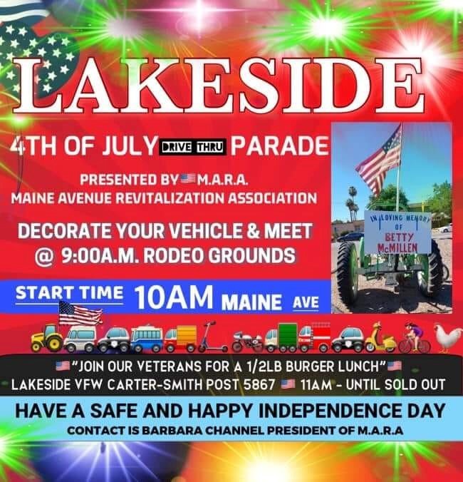 Printer-friendly versionEast County News Service June 21, 2023 (Lakeside) – The Maine Street Revitalization Association in Lakeside invites you to decorate your vehicle and join the Lakeside 4th of July