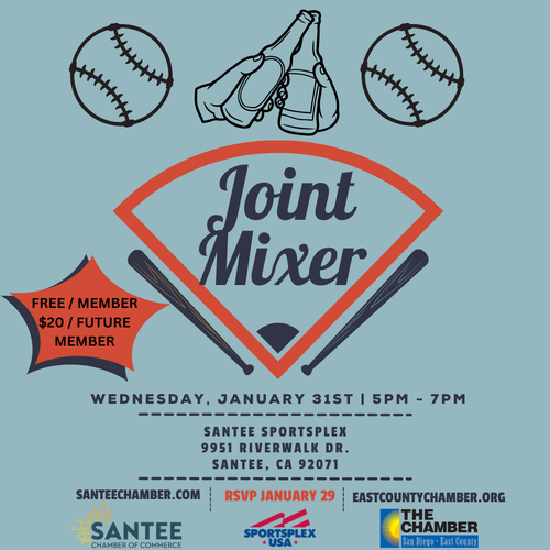 Printer-friendly versionBy Jonathan Goetz January 9, 2024 (Santee) — Santee Chamber of Commerce and the East County Chamber of Commerce invite you to a joint mixer hosted by Sportsplex USA Santee 9951 Riverwalk Dr,