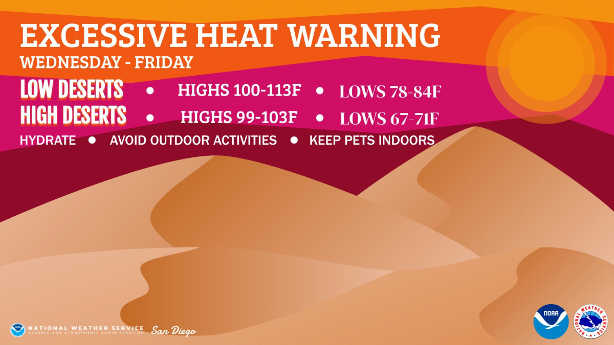 Printer-friendly version East County Wildfire & Emergency Alerts June 4,2024 (San Diego’s East County) –The National Weather Service warns that hot conditions up to 113 degrees will be present for San