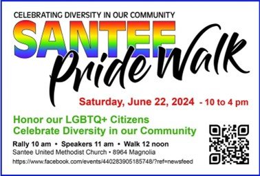Printer-friendly version East County News Service June 19, 2024 (Santee) –Celebrating diversity and honoring LGBTQ+ residents, the Santee Pride Walk will beheld on Saturday,June 22 from10 a.m.to 4 p.m. The