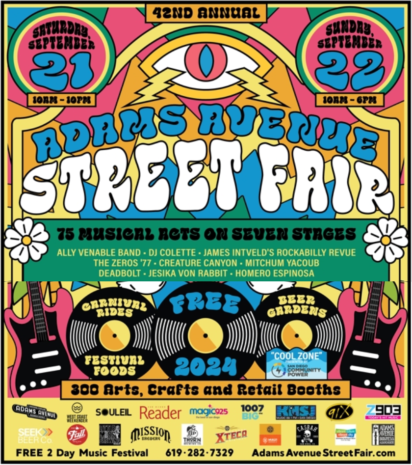 Printer-friendly versionEast County News Service This weekend! August 9, 2024 (San Diego) — The 42nd annual Adams Avenue Street Fair features 75 musical acts on seven stages and