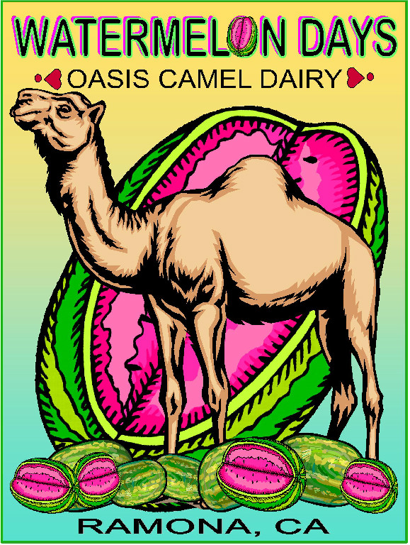 July 15, 2012 (Ramona) — Here’s a juicy story: the Oasis Camel Dairy will host its second annual Watermelon Days on July 21 & 22 from 1:00 to 3:30 p.m. at 26757 Old Julian Hwy in Ramona. Festivities include feeding watermelon to the camels, camel rides, an exotic bird show featuring talking and singing parrots and tours of the camel dairy.