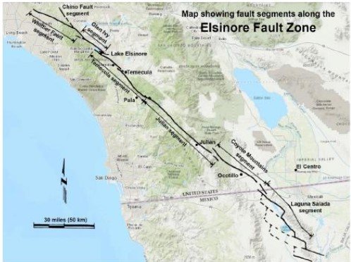 Printer-friendly versionBy G. A. McNeeley Map via Miracosta College April 16, 2025 (Julian) — While the 5.2 earthquake centered in Julian Monday was minor, the Elsinore Fault that produced it is capable of an 7.5 magnitude earthquake. Another thing to consider is that each point on the Richter scale is exponential, which means it’s 10 times stronger than
