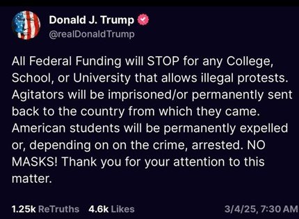 Printer-friendly version By Miriam Raftery March 3, 2025 (Washington D.C.) – Threats issued by President Donald Trump targeting colleges, universities and student protesters are illegal and unconstitutional, according to legal and civil liberties experts. Today, Trump posted on his social media account, “All Federal Funding will STOP for any College, School, or University that allows illegal protests. Agitators will