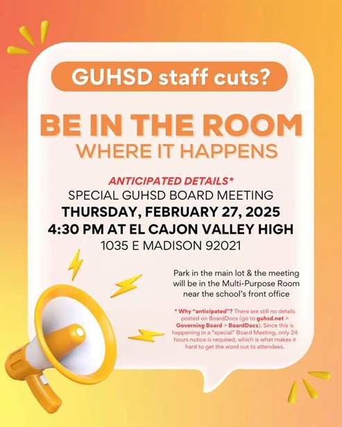 Printer-friendly version By Miriam Raftery February 27, 2025 (El Cajon) — At 4:30 today, the Grossmont Union-High School District is holding a special meeting to considering firing 49 employees including all high school librarians. Others targeted include English teachers, psychologists and more. Opponents of cutting librarians have set up a website at https://sites.google.com/view/save-guhsd-librarians/home. It includes a petition which has gathered