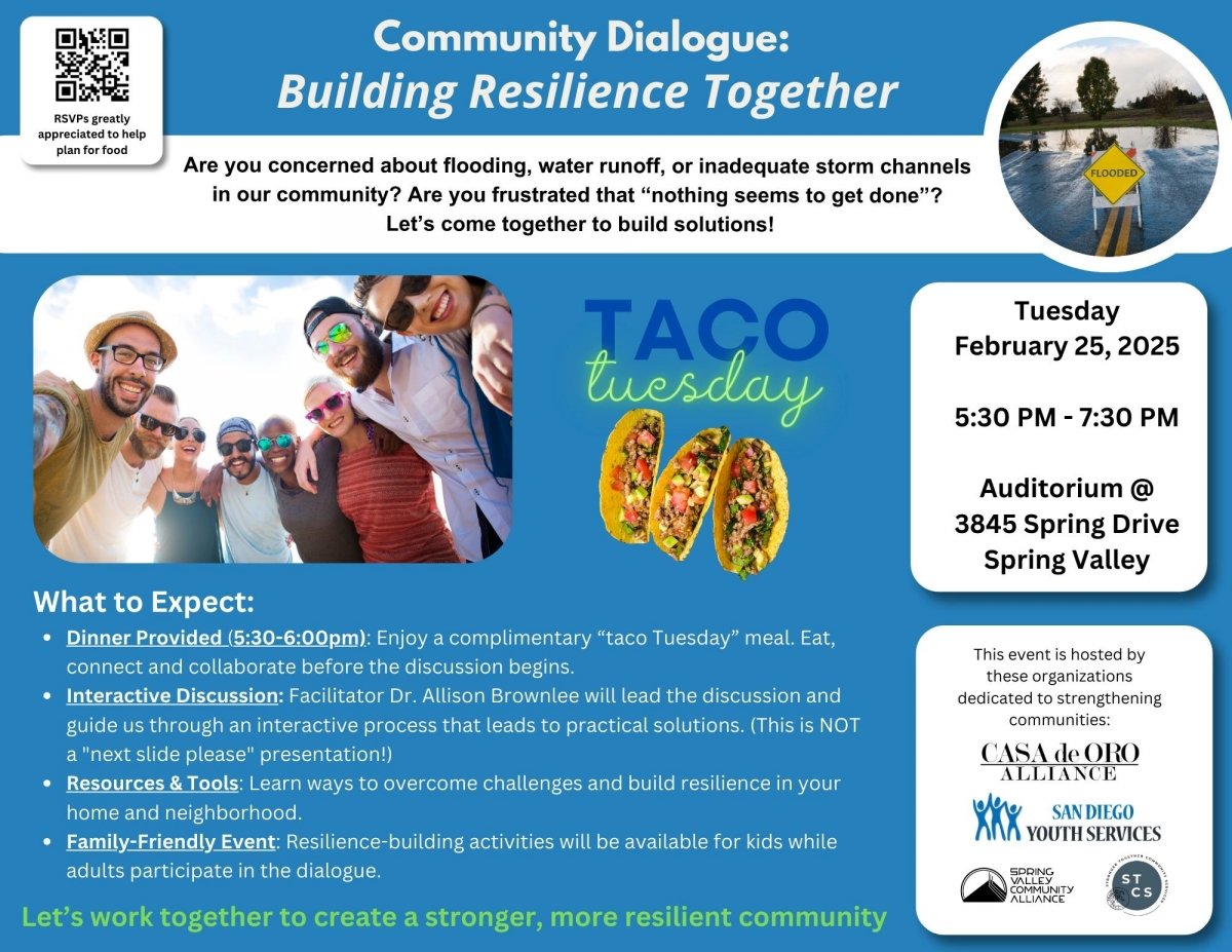 Printer-friendly versionEast County News Service February 15, 2025 (Spring Valley) — The Casa de Oro Alliance invites members of the community who have been affected by flooding to a community dialogue to help bring the community together and build resilience. The event is Tuesday, February 25 at San Diego Youth Services’ auditorium, 3845 Spring Drive, Spring Valley, CA 91977, starting