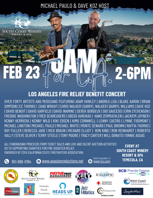 Printer-friendly versionBy Fire Chief Sam DiGiovanna February 12, 2025 (Temecula) — Come join us on February 23 at the beautiful South Coast Winery Resort and Spa in Temecula Ca. This event is supported by the California State Firefighters’ Association: CSFA. Smooth Jazz legend Dave Koz will be cohosting this event with Michael Paulo who have added Rick Braun, David Benoit,