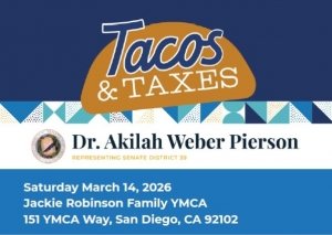 Printer-friendly versionEast County News Service Feb. 20, 2026 (San Diego County) — As the April income tax filing deadline looms, State Sen. Akilah Weber Pierson (D-SD) will serve up a unique blend of financial relief and local flavor next month. Weber Pierson’s office on Saturday, March 14, is hosting “Tacos & Taxes” at the Jackie Robinson YMCA. The event offers