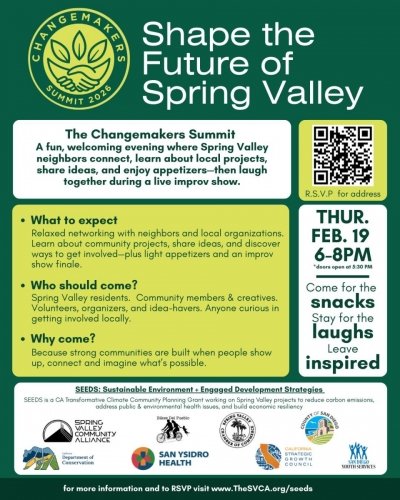 Printer-friendly versionSource: Spring Valley Community Alliance February 2, 2026 (Spring Valley) – The Spring Valley Community Alliance and Spring Valley Chamber of Commerce along with SEEDS partners invite residents and community members to the first-ever Spring Valley Changemakers Summit, a free community gathering designed to connect neighbors with local organizations and nonprofit partners, offering opportunities to learn about local projects, share