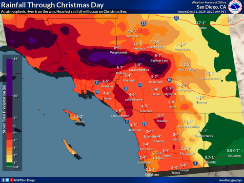 Printer-friendly versionEast County News Service December 22, 2025 (San Diego) – Be prepared for potentially heavy rains this week and take precautions if traveling due to rain-slicked highways and possible flooding in low-lying areas across southern California. Heaviest rainfall is expected Christmas Eve, with scattered showers on Christmas Day. San Diego’s mountains could get 3 to 6 inches of rain,