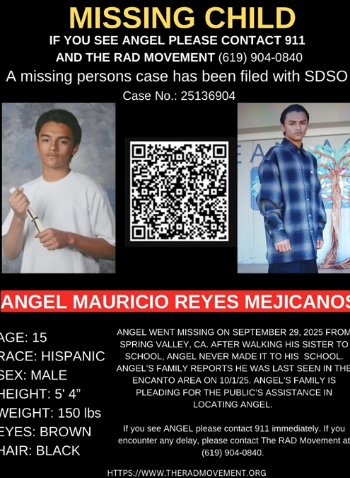 Printer-friendly versionEast County News Service October 7, 2025 (Spring Valley) – Public help is sought to local Angel Mauricio Reyes Mejicanos, 15, who vanished after walking his sister to school on September 29. He was reportedly sighted in the Encanto area on October 1. His family is pleading for public help to find him according to the RAD Movement, which