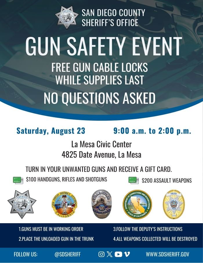Printer-friendly versionEast County News Services Aug. 18, 2025 (La Mesa) — As part of a broad effort to get unwanted firearms off the street, the San Diego County Sheriff’s Department is holding a “Guns for Gift Cards” event in La Mesa. The sheriff’s department is partnering with the city of La Mesa for the event, set for 9 a.m. until