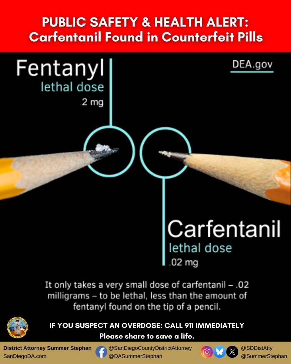 Printer-friendly versionBy Miriam Raftery August 19, 2025 (San Diego) – Carfentanil, a synthetic opioid that is 100 times stronger than fentanyl, has been found in the San Diego in fake M-30 oxycodone (pain killer) pills. District Attorney Summer Stephan warns, “Even tiny amounts can be deadly.” Just one pill can kill. Fentanyl test strips may not detect carfentanil, which was