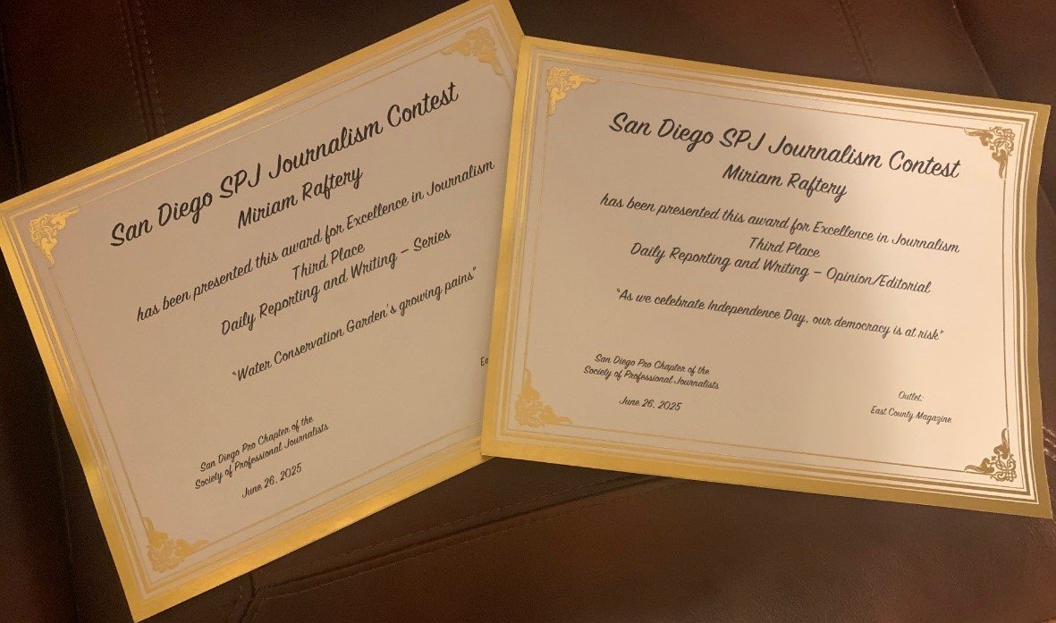 Printer-friendly version East County News Service June 27, 2025 (San Diego’s East County) – East County Magazine editor Miriam Raftery won two awards from Society for Professional Journalists in the San Diego SPJ Journalism competition. The honors bring ECM’s total awards to 149 since our founding in 2008. In the series category for daily reporting and writing, Raftery took third
