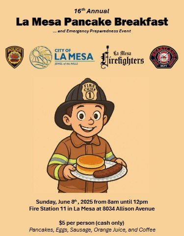 Printer-friendly versionEast County News Service June 6, 2025 (La Mesa) — Heartland Firefighters of La Mesa will host a pancake breakfast fundraiser and emergency preparedness training on Sunday, June 8, at La Mesa Fire Station 11. The event, which will run from 8 a.m. to 12 p.m. at 8034 Allison Ave., is open to all ages. Tickets are