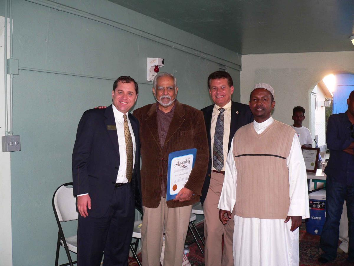 Assemblyman Marty Block presented Dr. Shaikh with a commendation from the State Assembly recognizing his achievements. Khaleel Mohammed, faculty representative from San Diego State University’s Department of Religious Studies, was also on hand to honor Shaikh’s efforts. In addition, a Sgt. Dave Pocklington represented Sheriff Bill Gore, praising Shaikh for his actions to combat hate crimes, particularly in the post-911 era.