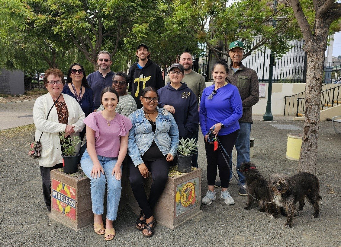 The coalition secured a $15,000 grant from Keep California Beautiful for the Promenade Park Beautification Project. Located along the trolley line in the heart of Broadway, Promenade Park had long been a hotspot for illegal dumping, substance use, and transient activity. The coalition’s plan includes a native pollinator garden, mural-ready surfaces, new trash and cigarette receptacles, dog waste stations, educational signage, and graffiti removal.