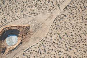 A photograph of preparations for a single wind turbine pad. Notice the new dirt road, and clearing around the pad, with a deep pit that will be filled with tons of cement and steel to anchor the turbine. Photo by Phillip Colla. Aviation support provided by LightHawk.