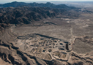A large swath of the desert is ripped open by Pattern Energy, probably to accommodate cement mixing operations. Wind turbines require large amounts of cement and steel to anchor the massive structures in the ground. Both ingredients require greenhouse gas intensive manufacturing. Photo by Phillip Colla. Aviation support provided byLightHawk
