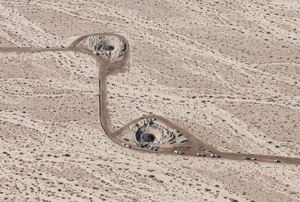 Wide new roads are carved into the desert soil to accommodate construction traffic and the arrival of turbine parts larger than an average home. The disturbance of the soil for roads will invite invasive plant species, create dust storms, and lead to further erosion of the adjacent desert habitat. Photo by Phillip Colla. Aviation support provided byLightHawk