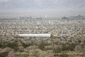 This photo shows a truck carrying just one section of a single turbine to the project site — the beginning of an industrial landscape near Ocotillo, California. The project will require dozens of additional trips by long-haul trucks to bring all of the required components. Photo by Jim Pelley.