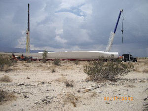 A single blade for a wind turbine requires its own diesel truck and two cranes. The blade dwarfs the desert vegetation. Photo by Park Ewing.