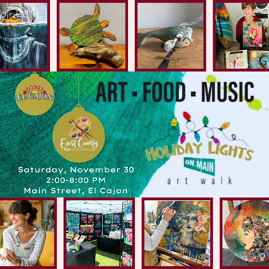 Printer-friendly version East County News Service November 27, 2024 (El Cajon) – East County Arts Association invites you to enjoy strolling down Main street in downtown El Cajon for a holiday art walk with 28 participating vendors offering everything from handmade jewelry to vibrant paintings, pottery and more. The event takes place Saturday, November 30 from 2 p.m.to 8
