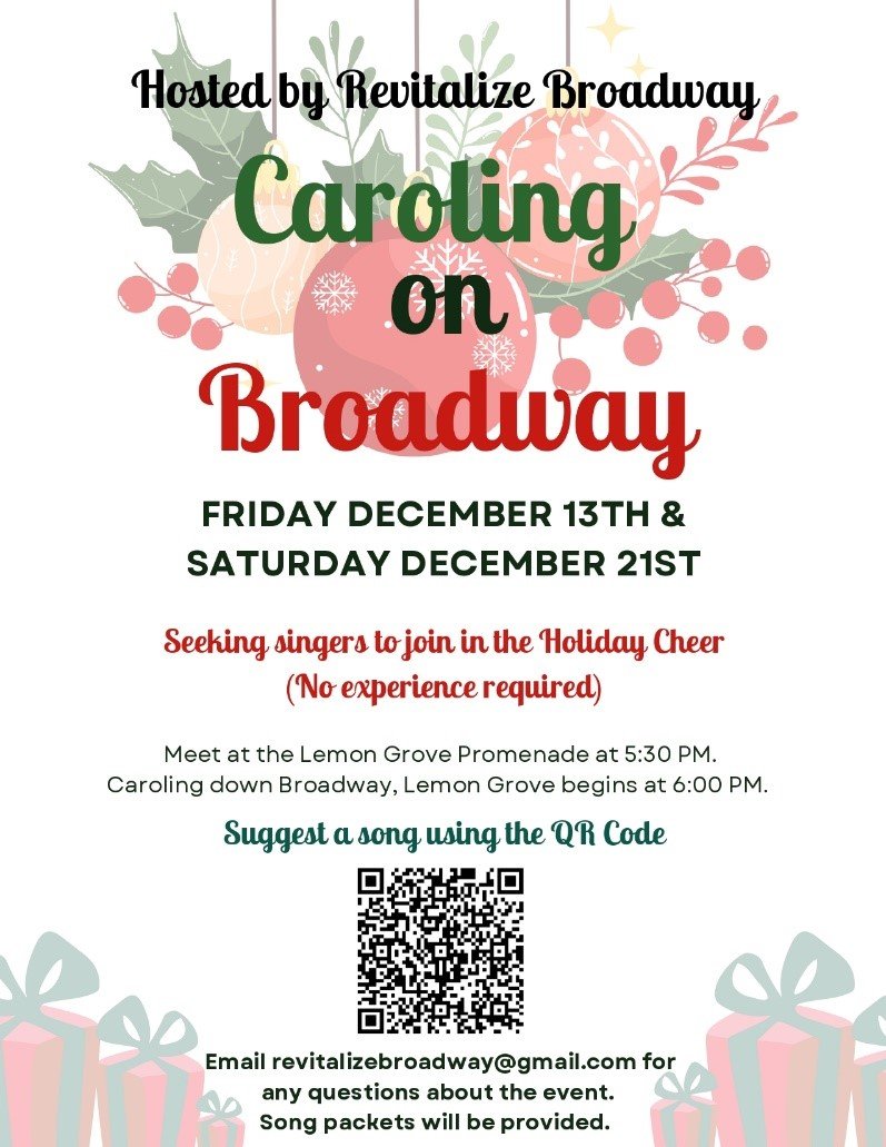 Printer-friendly version By Miriam Raftery November 30, 2024 (Lemon Grove) – ‘Tis the season to be jolly – so Revitalize Broadway invites singers (no experience required) to join in spreading some holiday cheer. Caroling on Broadway will take place Friday, December 13 and Saturday, December 21. Meet at the Lemon Grove Promenade at 5:30 p.m. for caroling down Broadway, which
